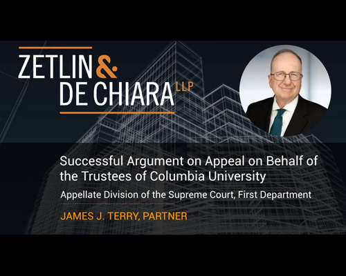James J. Terry, Partner, Zetlin & De Chiara, LLP, successfully argued the appeal on behalf of The Trustees of Columbia University in the City of New York. Mr. Terry was assisted in the preparation of his argument by Max Rayetsky, Associate.